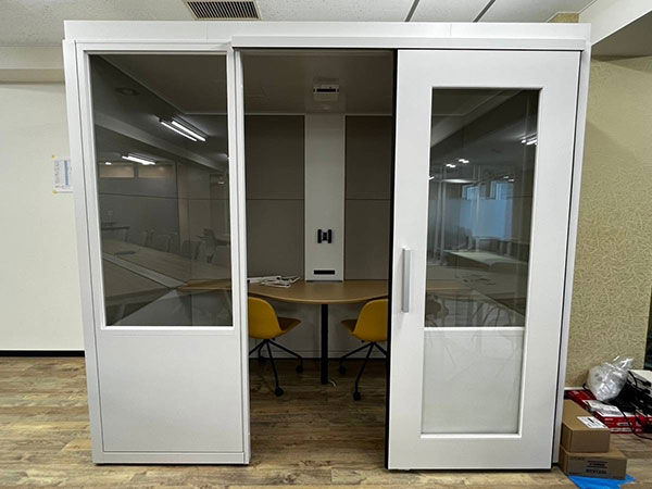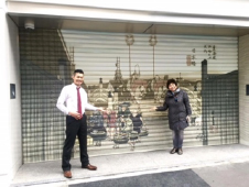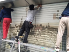 シャッターの下からイラストを一枚ずつ丁寧に貼り付けます。