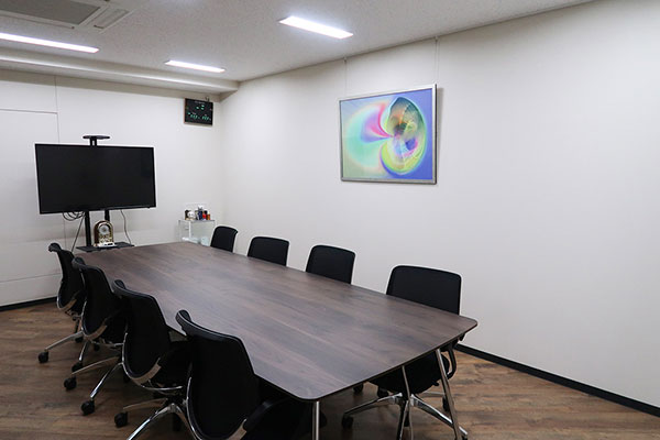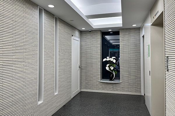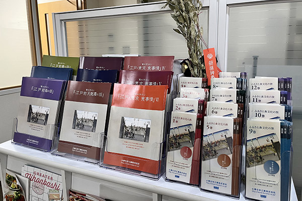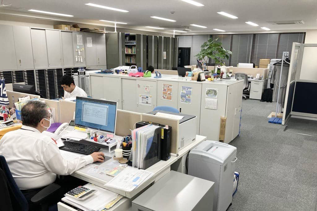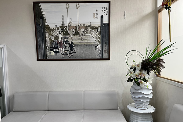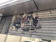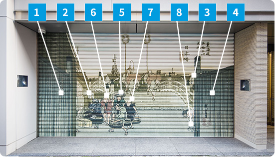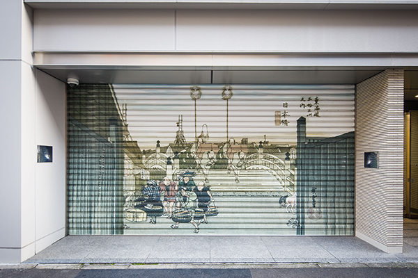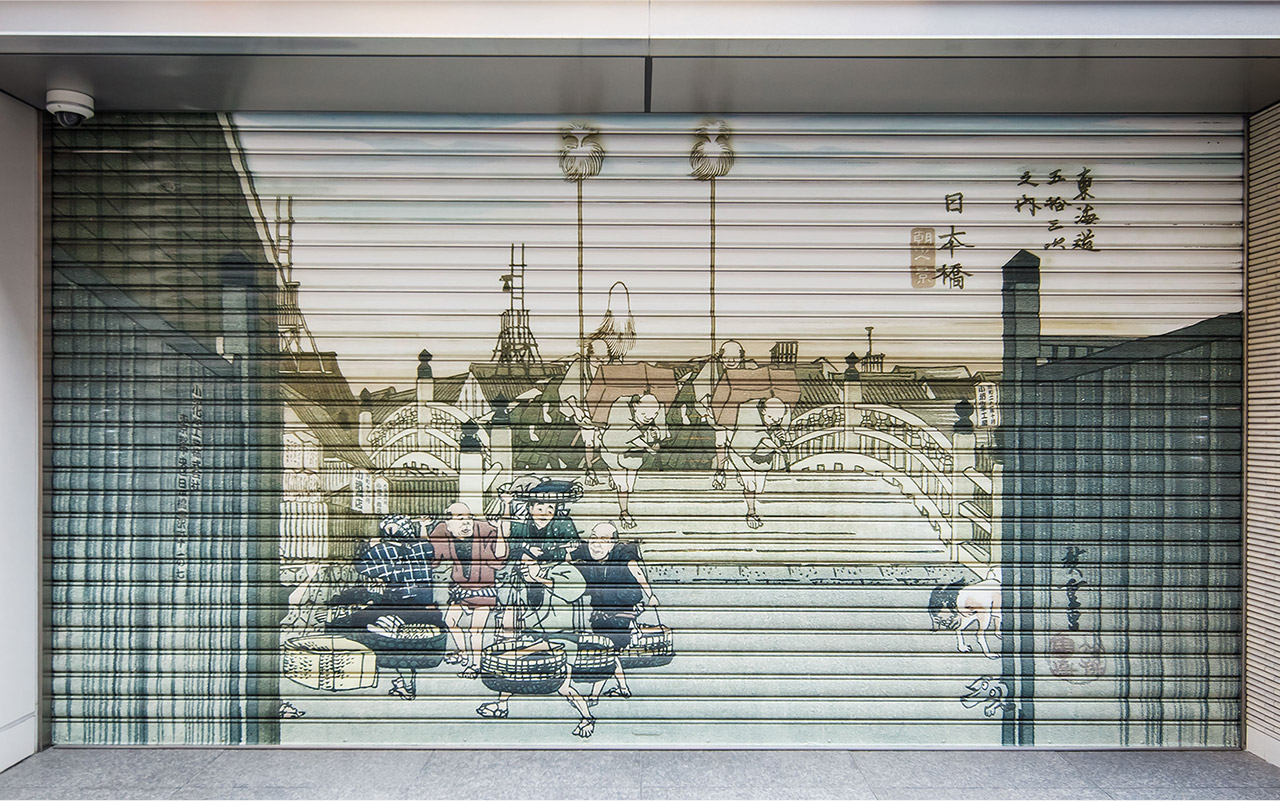 本社、新社屋の顔として「シャッター絵」があります。この作品は、創業100周年事業の1つとして新社屋移転時に制作されました。シャッター絵に採用したイラストは、当社のシンボルとして使用していた歌川広重(東海道五十三次)の「日本橋朝之景」オリジナル版に、当社三代の当主(小堺長一、榮一、裕一郎)の似顔絵など取り入れ、リデザインしたものです。